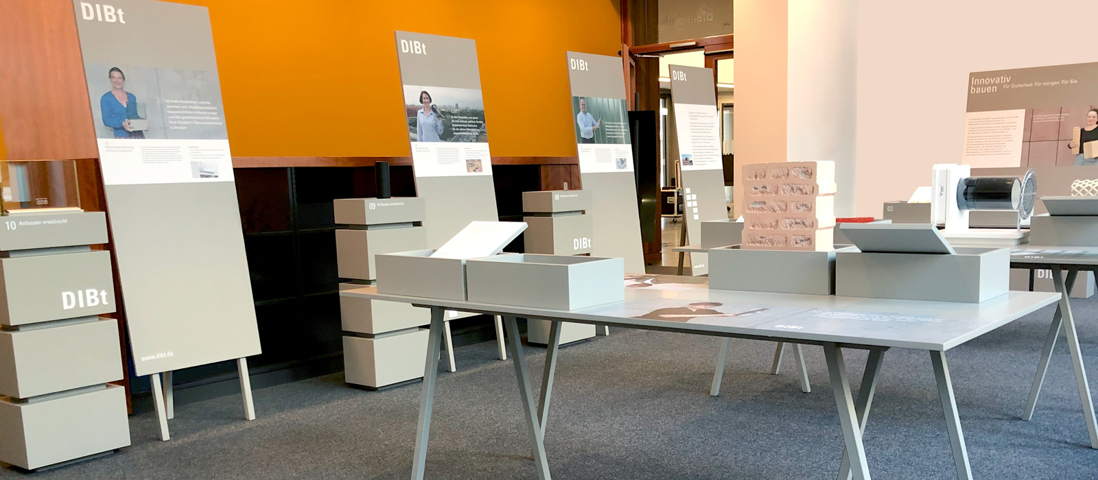 Als bautechnisches Kompetenz­zentrum unterstützt das DIBt Bund und Länder rund um das Thema Bausicherheit. In einer mobilen Ausstellung stellen DIBt-Mitarbeitende Produkte vor, die stellvertretend für das DIBt-Leistungs­spektrum stehen. Alle Exponate werden so präsentiert, dass Innovation erkennbar und im Wortsinn begreifbar sind.