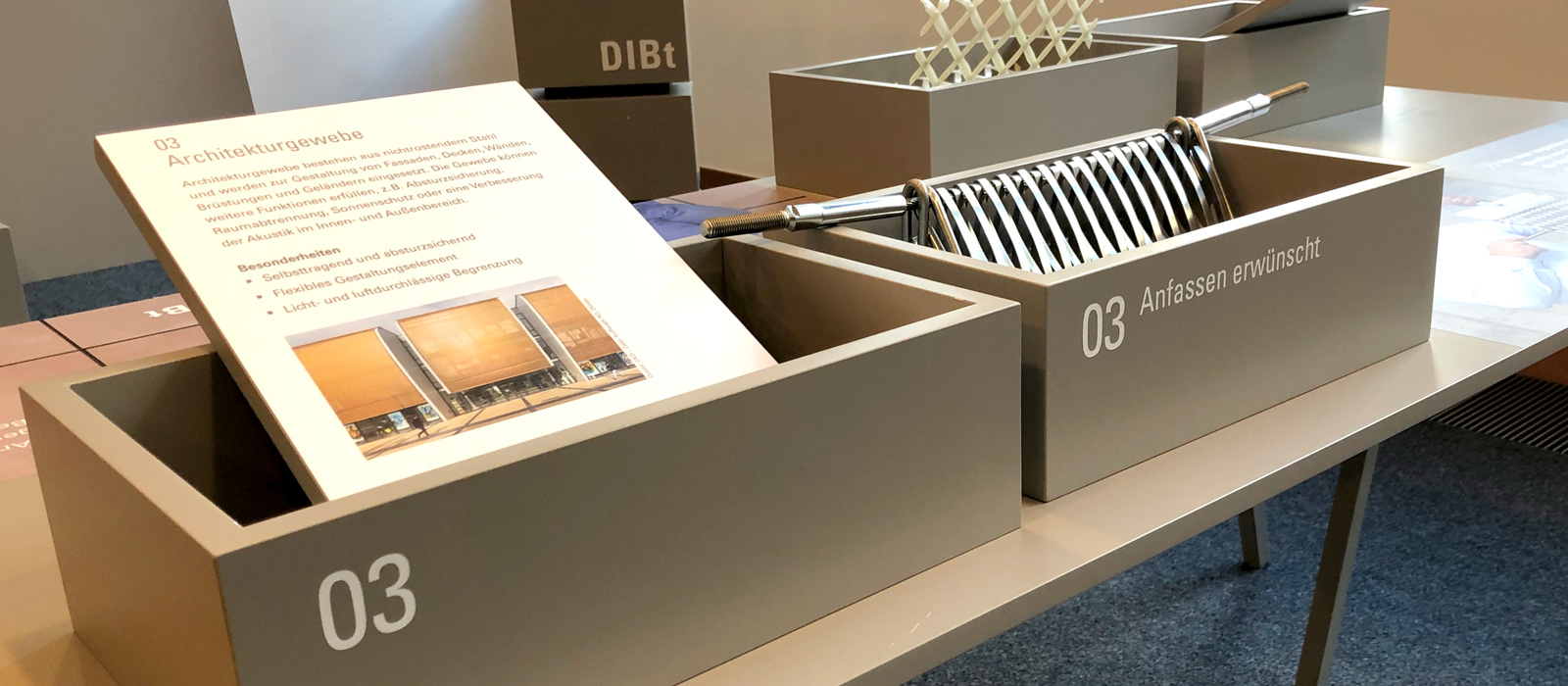 Als bautechnisches Kompetenz­zentrum unterstützt das DIBt Bund und Länder rund um das Thema Bausicherheit. In einer mobilen Ausstellung stellen DIBt-Mitarbeitende Produkte vor, die stellvertretend für das DIBt-Leistungs­spektrum stehen. Alle Exponate werden so präsentiert, dass Innovation erkennbar und im Wortsinn begreifbar sind.